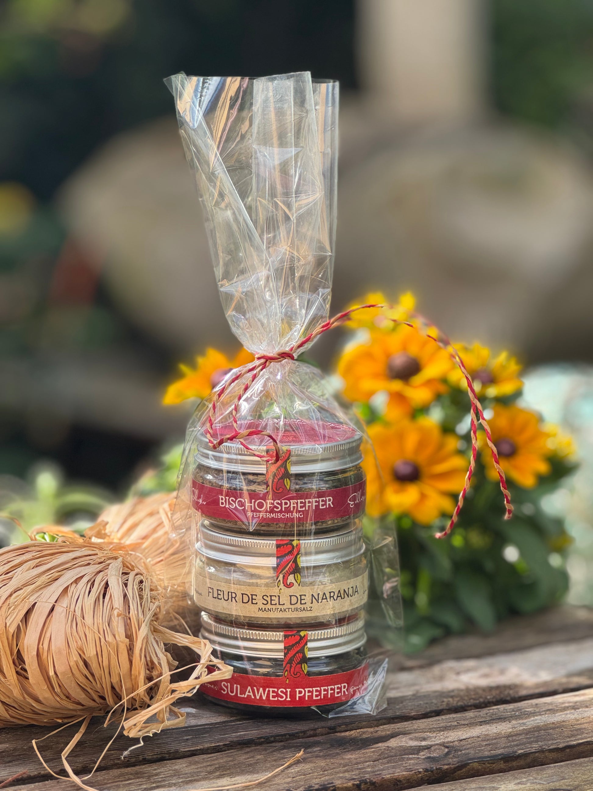 Dieses exklusive Geschenkset vereint drei außergewöhnliche Gewürze, die perfekt aufeinander abgestimmt sind, um Gerichten eine festliche und raffinierte Note zu verleihen. Mit dem seltenen und aromatischen Sulawesi-Pfeffer, einer weihnachtlich inspirierten Pfeffermischung und dem frischen Fleur de Sel mit Orangenzesten ist dieses Set eine vielseitige Bereicherung für jede Küche – ideal für Feinschmecker und Liebhaber edler Gewürze.
